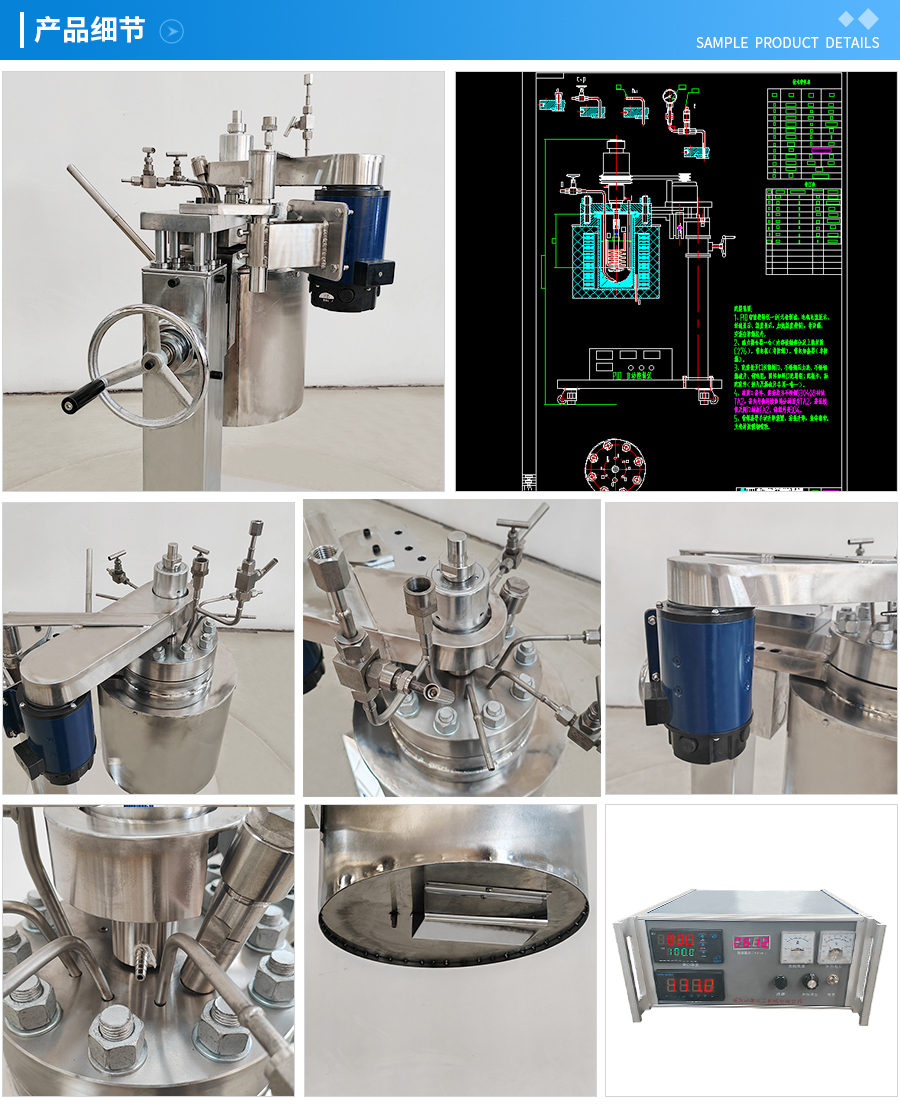 常規(guī)釜蓋開口 氣相口配針形閥,液相口配針形閥及釜內(nèi)插底管,固體加料口配絲堵,測控溫口配鉑電阻,壓力表安全爆破口配壓力表及安全防爆裝置,釜內(nèi)冷卻盤管進、出口配水咀